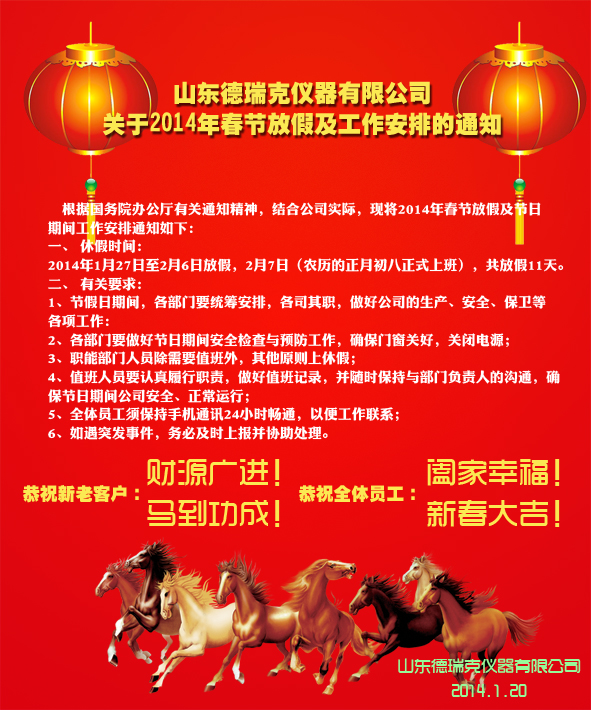 山東德瑞克2014年春節(jié)放假通知