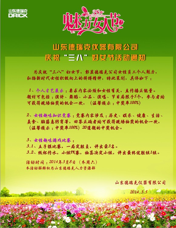 我國(guó)于194912月規(guī)定每年的38日婦女節(jié),迄今為止已有60多年的歷史,而今年恰逢是三八婦女節(jié)第65周年。為了活躍企業(yè)文化氛圍,表彰和感謝女同胞們?yōu)楣咀龀龅呢暙I(xiàn),山東德瑞克儀器有限公司決定于38日為所有女員工準(zhǔn)備了一系列別開生面的歡慶活動(dòng),在表彰和感恩的同時(shí)也為德瑞克女同胞們展示個(gè)人才藝,彰顯女性風(fēng)采提供了一個(gè)良好的舞臺(tái)?;顒?dòng)具體內(nèi)容如下: